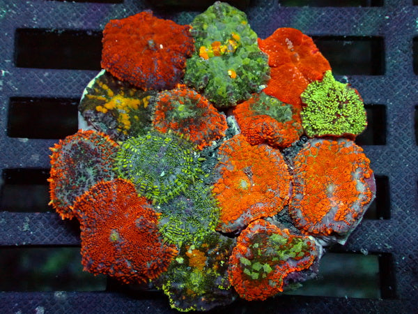 Der Rhodactis/Discosoma Mushroom Garden Mix ist eine farbenfrohe Auswahl verschiedener Scheibenanemonen, die zu einem lebendigen und abwechslungsreichen Highlight im Riffaquarium werden. Die Mischung besteht aus unterschiedlichen Polypenformen und Farbvarianten, die je nach Art weiche Strukturen, glatte Oberflächen oder fein geknubbelte Muster zeigen. Dieser bunte Mix eignet sich hervorragend, um freie Flächen im Riff zu begrünen oder dekorative Farbinseln zu schaffen.