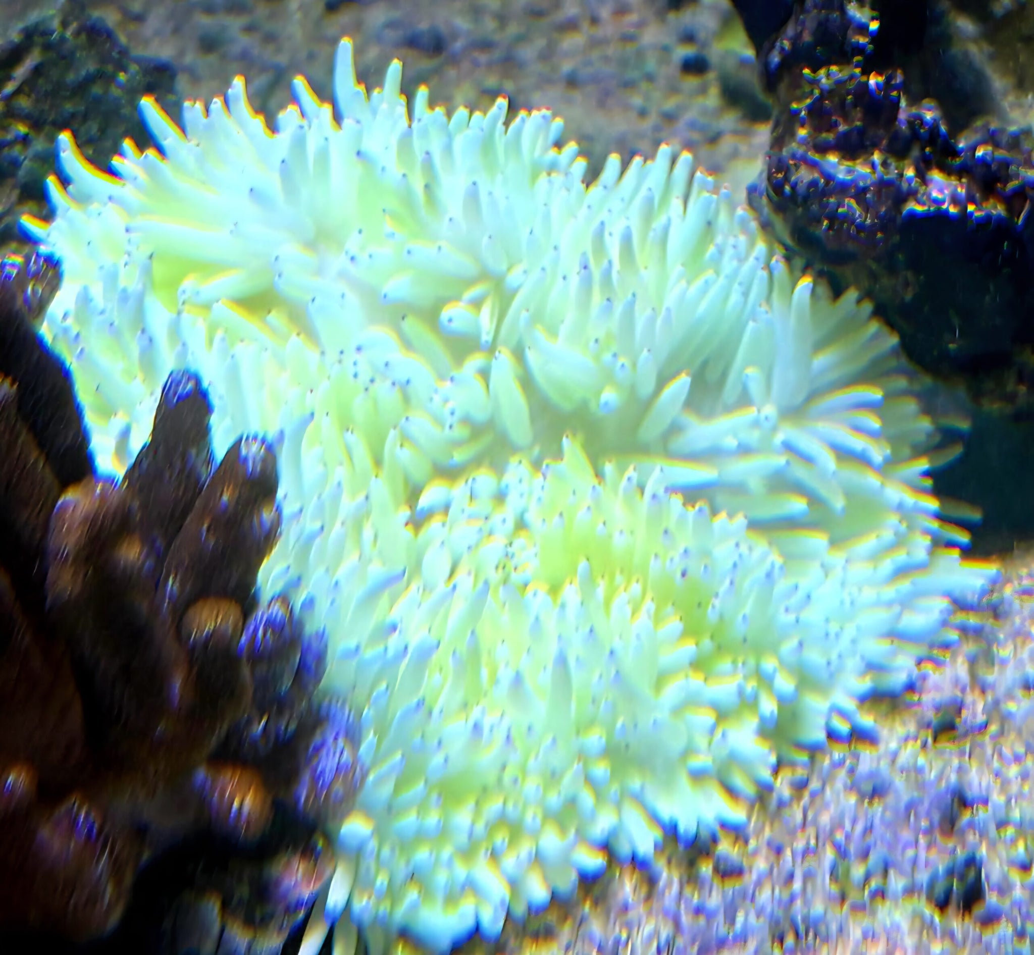 Die gelbe Farbform der Heteractis crispa zählt zu den seltenen und besonders attraktiven Varianten dieser eleganten Symbioseanemone. Ihre langen Tentakel schimmern in warmen Gelbtönen, die je nach Beleuchtung zwischen golden, sonnig und pastell wirken können. Durch ihre weichen, fließenden Bewegungen bringt sie eine ruhige Ausstrahlung in das Riffaquarium.